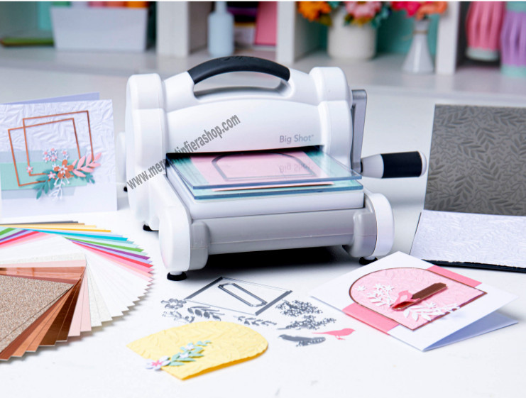 1 macchina Sizzix Big Shot, 1 coppia di piani da taglio standard A5, 1 piattaforma standard, 1 adattatore per fustelle sottili, 1 libretto di istruzioni, 10 fustelle Thinlits, 1 Multi-Level Texured Impressions (embossing folder), 20 cartoncini 15x15 cm (20 diversi colori) + 20 cartoncini 15x15 cm Opulent (rosa, oro e avorio con diverse finiture).