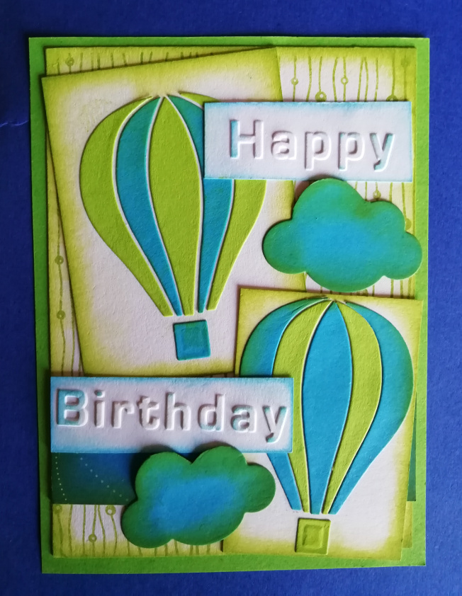 Biglietto auguri realizzato con fustelle per Big Shot mongolfiera, folder embossing sizzix e timbri in polimero