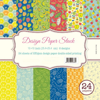 Blocco Carta Fantasia Frutta 230gr. Carta di qualità grammatura 230 gr/mq. 24 fogli stampa su due lati, (grandezza foglio cm. 25,4x25,4), sei fantasie quattro fogli fronte/retro per fantasia.