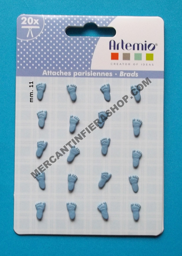 Brads Piedini celesti Comfezione da 20 fermacampioni in alluminio marca Artemio.Applicazione: è sufficente fare un forellino sulla carta inserire il fermacampione e piegare le alette sul retro.