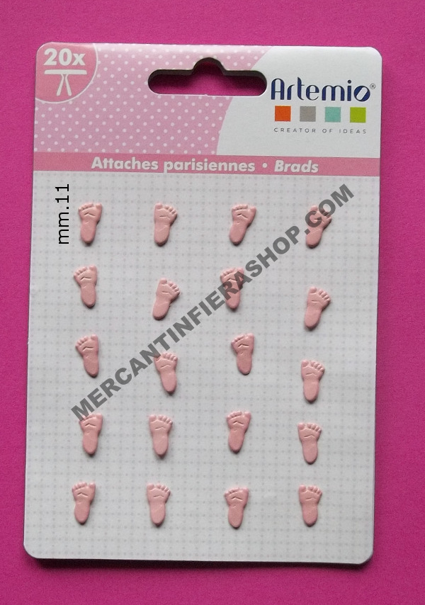 Brads Piedini rosa Comfezione da 20 fermacampioni in alluminio circa cm. 1,10 marca Artemio.Applicazione: è sufficente fare un forellino sulla carta inserire il fermacampione e piegare le alette sul retro.