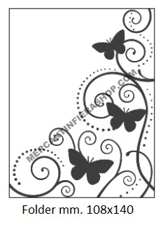 Embossing Folder Farfalle per Big Shot Folder per groffare, compatibile con Big Shot e altre macchine.adatta per cartoncino, lamina alluminio leggera, ecc... Misura folder: cm. 11 x 14,50. L'embossing folder si apre a libro e all'interno di esso va posizionato il cartoncino. Non serve utilizzare l'adattatore di color verde normalmente in dotazione con le Big Shot della Sizzix poichè l'embossing folder ha già uno spessore doppio. Il risultato finale dopo il passaggio nella Big Shot è un bellissimo effetto in rilievo sul cartoncino o sulla lamina utilizzata.
