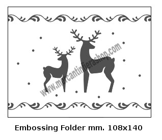 Embossing Folder Renne per Big Shot Folder per groffare, compatibile con Big Shot e altre macchine.adatta per cartoncino, lamina alluminio leggera, ecc... Misura folder: cm. 11 x 14,50. L'embossing folder si apre a libro e all'interno di esso va posizionato il cartoncino. Non serve utilizzare l'adattatore di color verde normalmente in dotazione con le Big Shot della Sizzix poichè l'embossing folder ha già uno spessore doppio. Il risultato finale dopo il passaggio nella Big Shot è un bellissimo effetto in rilievo sul cartoncino o sulla lamina utilizzata.