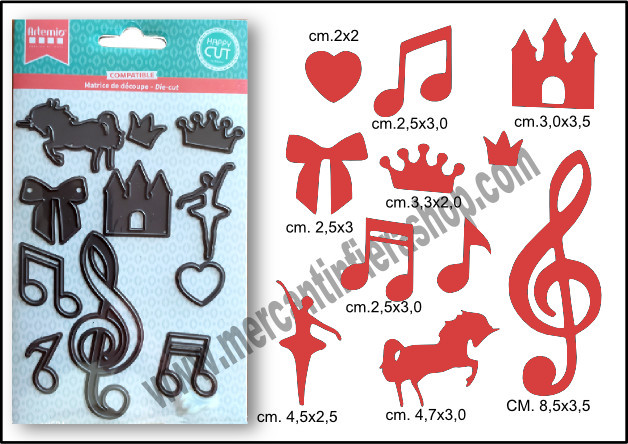 Fustella Sottile Musica Set 10 fustelle metalliche sottili Artemio, tipo thinlits compatibile con Sizzix Big Shot, Big Shot Plus e altre macchine di taglio. Adatta per il taglio di carta, cartoncino, lamina alluminio, eva foam e gomma crepla. Grazie alle fustelle sottili tipo thinlits puoi tagliare forme estremamente dettagliate che userai per il tuo Cardmaking o scrapbooking. Quando utilizzi le fustelle sottili con la Big Shot ricordati di utilizzare l'adattatore verde, grazie a queste fustelle potrai realizzare dalbiglietto d'auguriper qualunque occasione alla partecipazione di nozze. Insomma basta solo un pò dicarte tinta unita o stampata,colla e biadesivo , fustelle e fantasia per creare qualcosa di assolutamente unico semplicemente perchè l'hai realizzato tu! Se vuoi vedere un video come utilizzare le fustelle vai alla pagina tutorial del sito oppureclicca qui