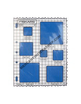 Maschera di taglio Fiskars quadrati Dima di taglio da utilizzare con Shape Cutter Fiskars. Si possono utilizzare anche come semplici dime per disegnare e tagliare a mano o con cutter pirovante. Misure lato: 2,7 - 3,4 - 5,4 - 6,5 - 7,8 - 9 cm.