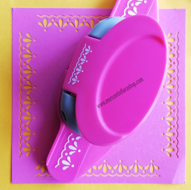 Perforatrice per bordature continue anche sui quattro lati del cartoncino. Il disegno sulla base d'appoggio esterno consente di realizzare una decorazione sul bordo precisa, senza errori di sovrapposizione, clicca sulla graffetta (allegati) per vedere le istruzioni.