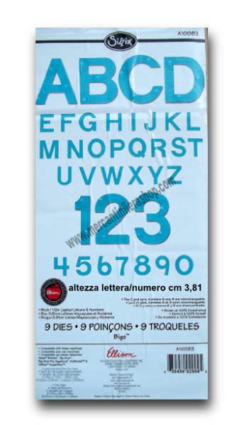 Confezione di 9 fustelle alte alfabeto maiuscolo e numeri. Altezza lettera/numero 3,8 cm. Per Big Shot, Big Shot Plus Sizzix e altre macchine di taglio. Adatte al taglio di carta, cartoncino, tessuto, feltro, eva foam, ecc..
