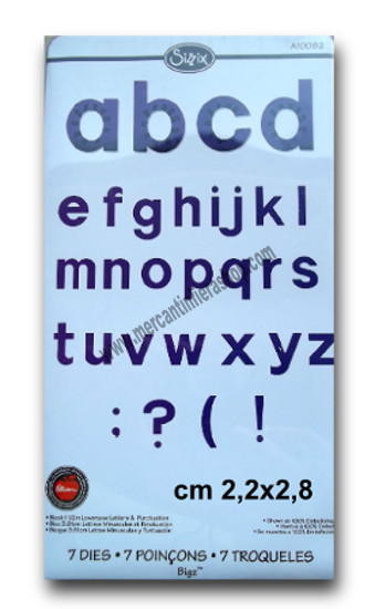 Confezione di 7 fustelle alte alfabeto minuscolo. Altezza lettera 3,8 cm. Per Big Shot, Big Shot Plus Sizzix e altre macchine di taglio. Adatte al taglio di carta, cartoncino, tessuto, feltro, eva foam, ecc..