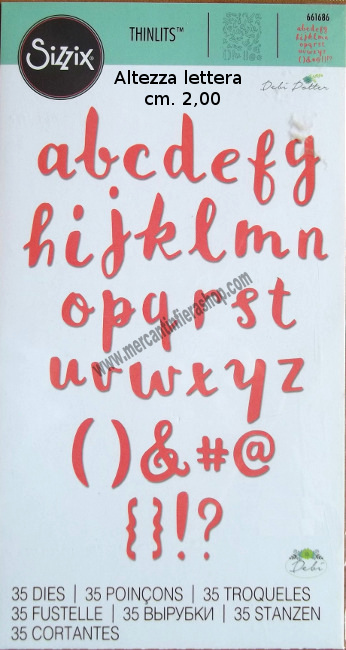 Set 35 fustelle Thinlits Sizzix per Big Shot, Big Shot Plus e altre macchine di taglio. Adatta per il taglio di carta, cartoncino, lamina alluminio, eva foam e gomma crepla. Altezza lettera da cm. 2,00 a cm. 3,00